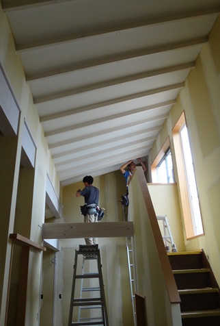 内部の塗装が完了すると、クロス張りに移ります。今回は天井、壁ともに同じクロスを採用しました。明るいところ、暗いところ、天井が低いところ、高いところ、垂木が狭い間隔で並ぶところ、梁が広い間隔で並ぶところ・・・