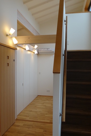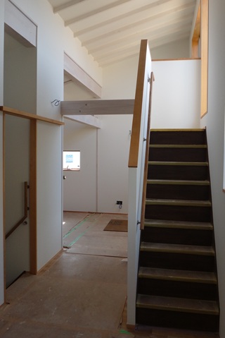 クロス張りが完了しました。下地の石膏ボードの色(黄色のような茶色のような・・・)と比べると、壁全体が白くなったことで部屋の印象も明るくなっています。クロスを張る前は梁の白がなんとなく浮いていましたが、色が納まり、造作(手すりやドアの木枠)の自然な木の色が浮かび上がりました。