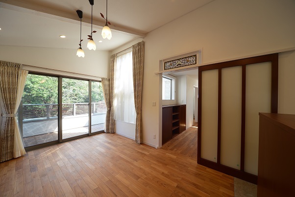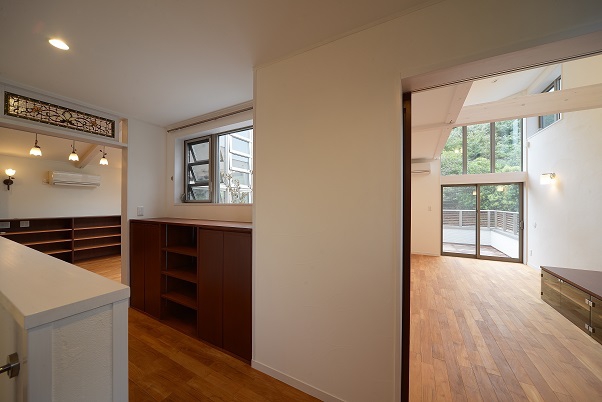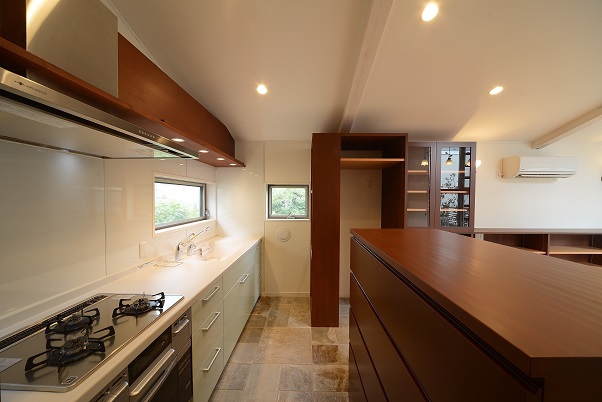 設計当初から持ち込みを予定していた家具があり、それらに合わせた扉のデザインや仕上げ部材の配色計画をしました。床は無垢のチークフローリング、壁は漆喰です。キッチンの床は水ハネを考慮し、タイルを張りました。