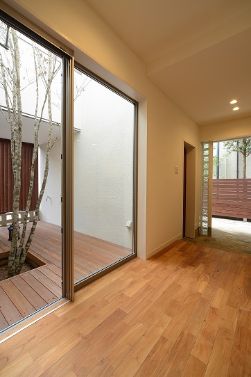 多くの部屋から中庭が見えるようになっています。株立ちのヤマボウシ1本が四季の変化を感じさせてくれる居心地のよい住まいです。