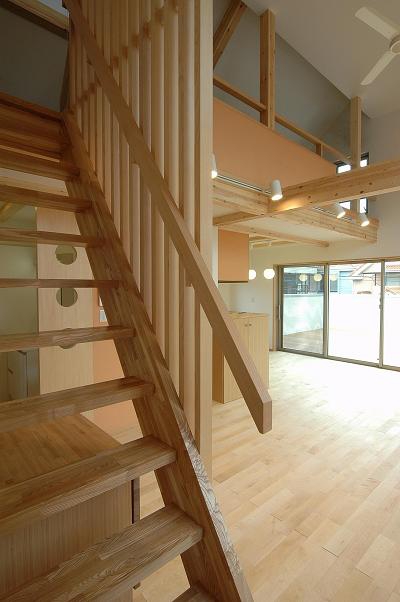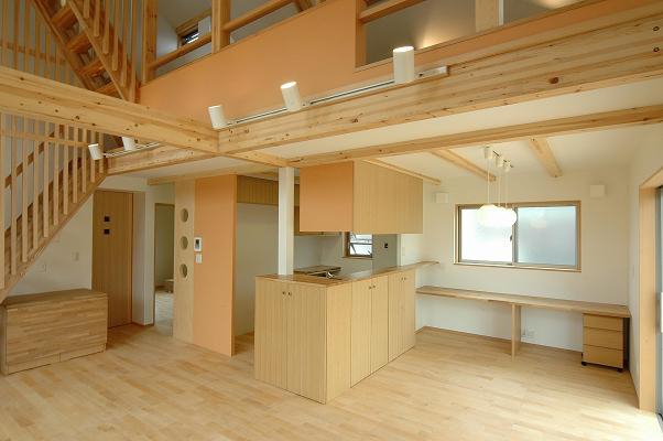 1階に寝室や浴室等の水廻りを、2階にリビング・ダイニングや子供部屋を配置。リビングの上部にはロフトがあり、吹き抜けによって一体の空間になっています。SE構法と外断熱(長期優良住宅)を採用。冷暖房費を抑えつつ、気持ちの良い空間になっています。