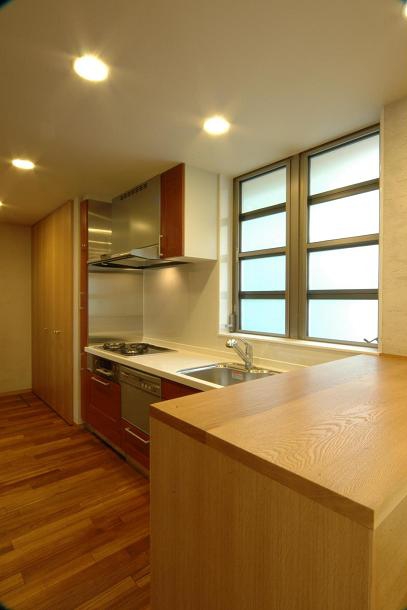 扉・家具はすべてナラ材で、カウンターや階段は無垢板を使用。深い味わいに仕上がっています。