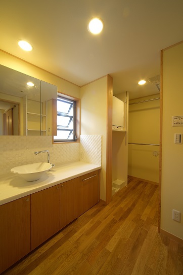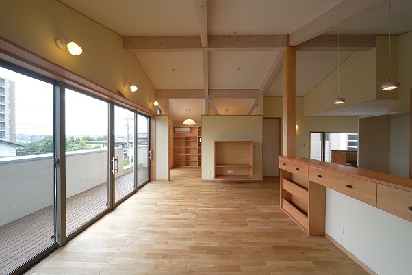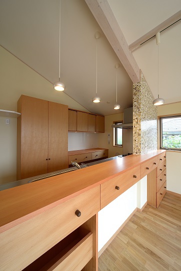 設計だけではなく、監理にも責任をもって工事を進めていただくことにも重点をおいて設計事務所を探しました。よって、『設計者と施工者との協働』ということが決めてのひとつとなりました。まず、プランについては熟慮し何度も修正していただきながら最終案にたどり着きました。2階のダイニングキッチンからの眺めや風通しがとても良くその点が気に入っています。断熱材や建材などは製造時のエコと住んでからのエコの両面から検討しアドバイスを頂きながら選定しました。建て主の要望に対し、防音室や将来のバリアフリーに向けての対策から細部に至るまで、あらゆる面から調べた上でプロとしてのアドバイスを頂くことができ、安心できました。工事も担当した工務店と連携をとりながら進めていただきました。たとえば、断熱については途中で建て主検査をしていただき、その場で監督さんたちと手直ししたりと納得いくまで対応をしていただきました。仕上げについても時間があるときには何度も現場に足を運び大小に関わらず細かい修正にも対応していただき良かったと思います。タイル、壁紙、左官仕上げなどよく検討し決めていきました。ちょっと冒険したところもありますが気に入っています。