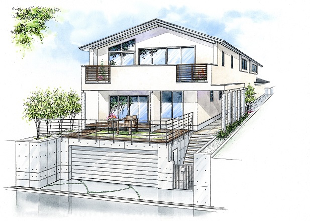 南向きひな壇の敷地に建つ、擁壁を兼ねた鉄筋コンクリート造の地下車庫と木造2階建ての住宅です。木造の良さを生かした自由なプランニングと構造を見せる意匠を意識して設計しています。