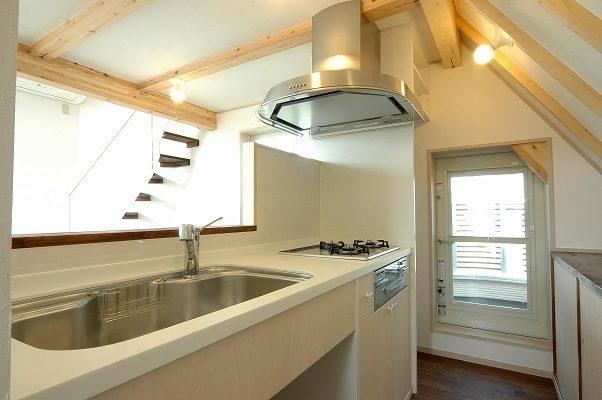 各階広く使えるよう間仕切りの無いワンル-ム形式にしています。3階には居間、食堂、キッチン、トイレがあり吹抜けを介して4層目のロフトがあります。ロフトにはスライド式のトップライトがあり屋上に出ることも出来ます。屋上はバ-ベキュ-や屋上菜園楽しみたいということで約7畳程度の広さが有ります。