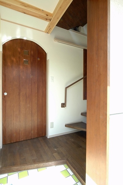 床は無垢のナラ材。壁は自然素材の先進国、ドイツの漆喰です。扉はすべて手造りです。交通量の多い通りに面しているので、防音・断熱効果の高いセルロ-スファイバ-(100%新聞紙のリサイクル)充填断熱工法を採用しています。パッシブ設計により設備には極力頼らず夏は涼しく、冬暖かい住まいになっています。