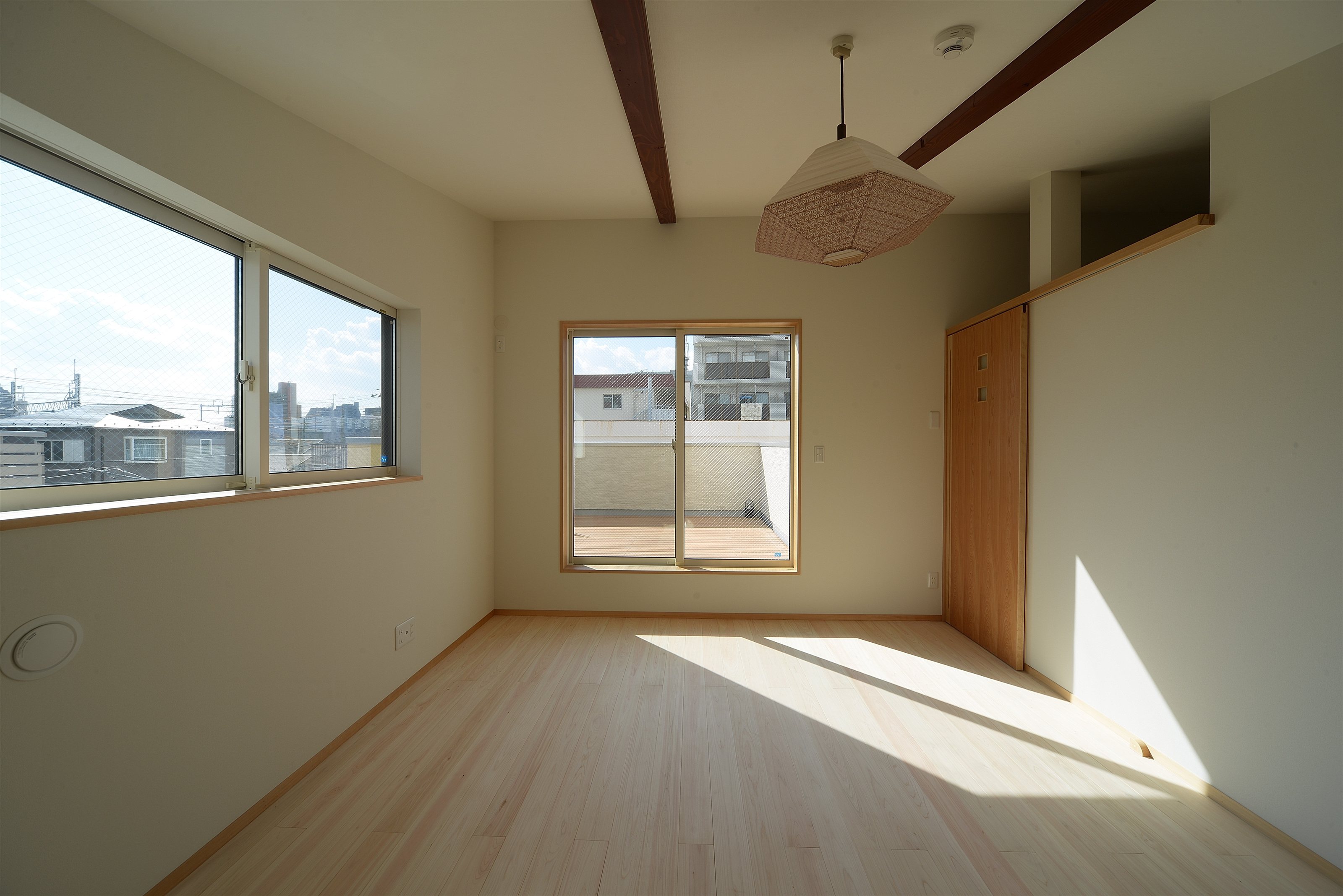 準防火地域のため3階建てにすると建物を準耐火構造にする必要がありました。鉄骨に比べコストを抑え、自由なプランニングが出来るので木造準耐火構造を採用していますが、木造らしく木の階段や一部梁をあらわしにしています。付近は住宅が密集しているためプライバシ-を確保しつつ陽射しを採り込めるよう窓やウッドデッキの場所、高さの工夫をしています。