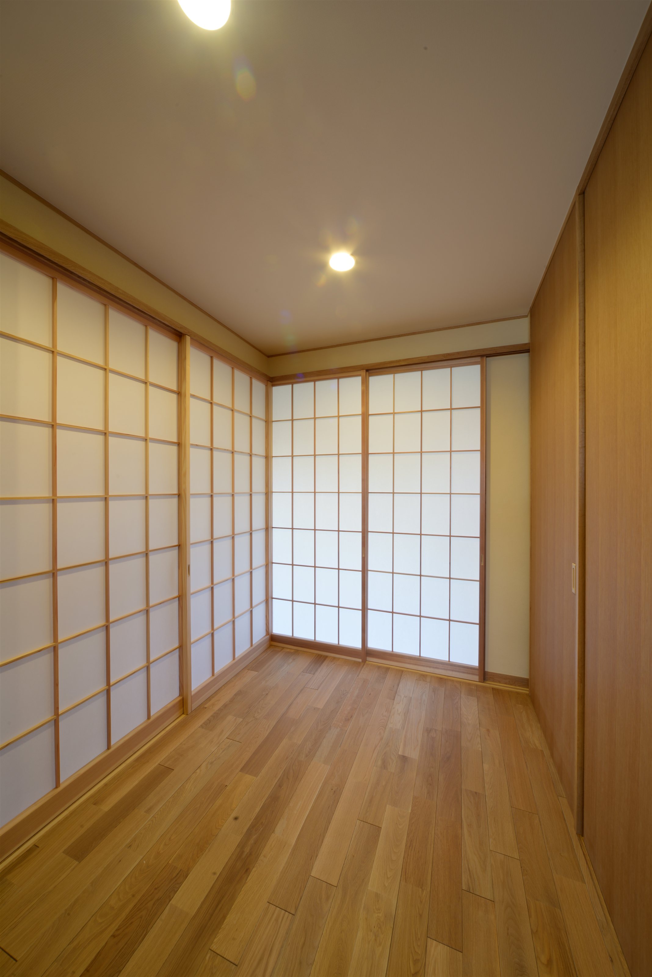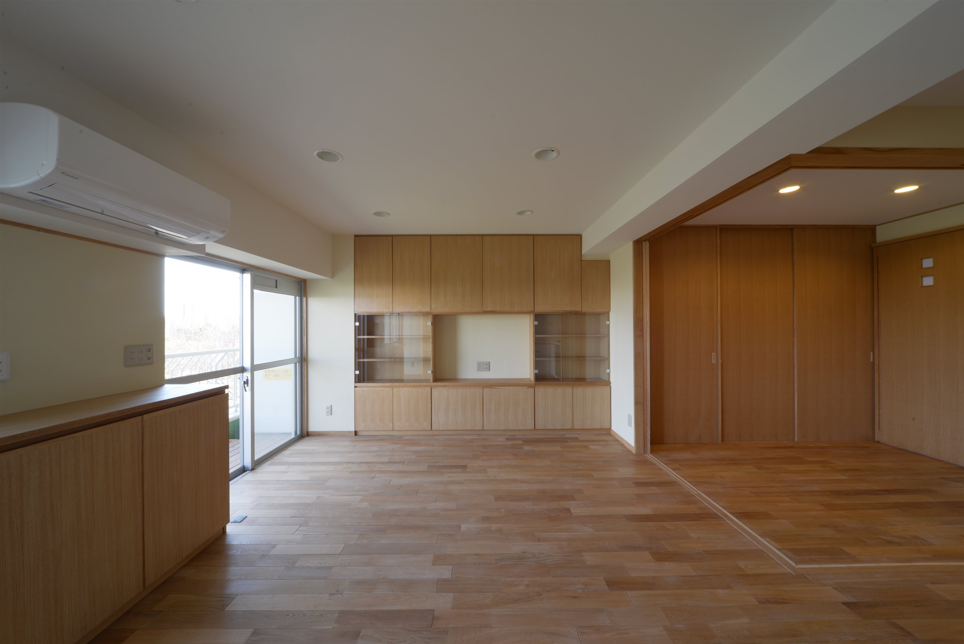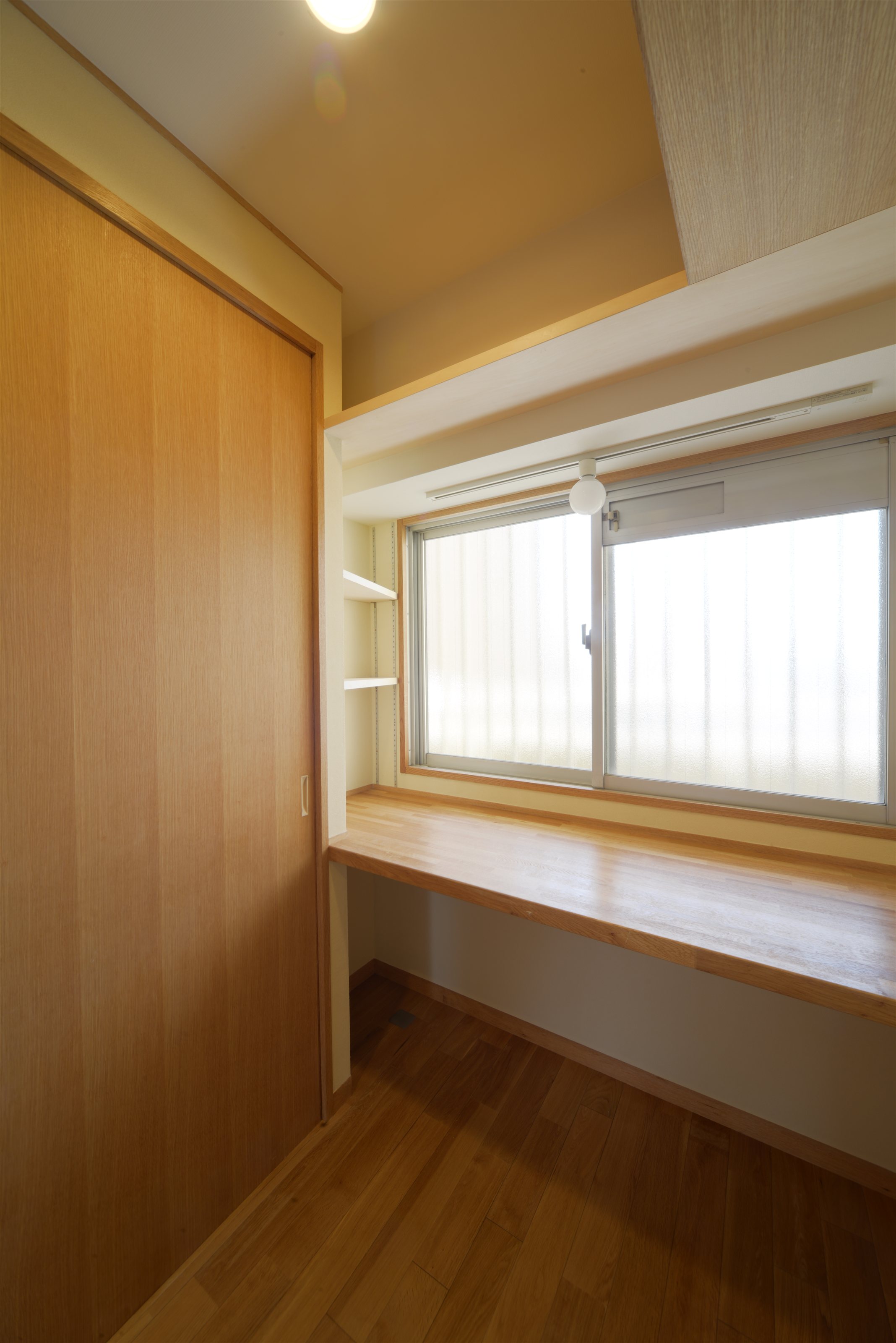基本的なプランの変更はありませんでしたが、自然素材をふんだんに採用しました。床は無垢のナラ材、壁は左官仕上げ(珪藻土)、扉はナラ材や桧となっています。収納家具も全て造り、スッキリ納めることと見せることができる収納になっています。