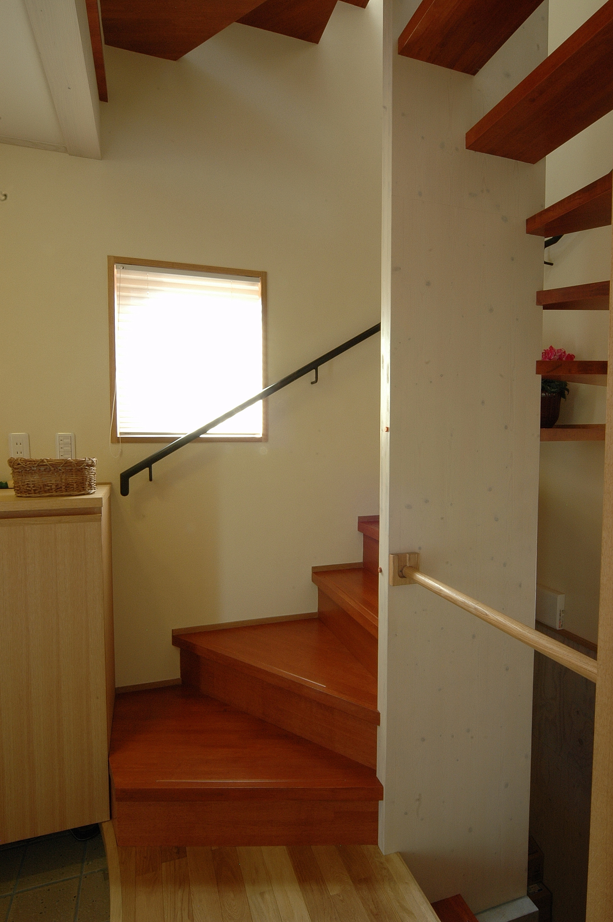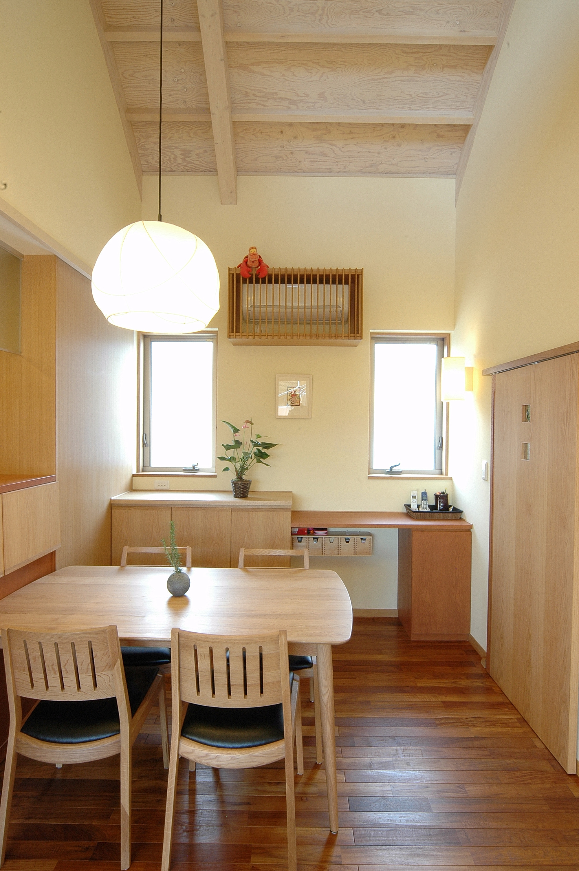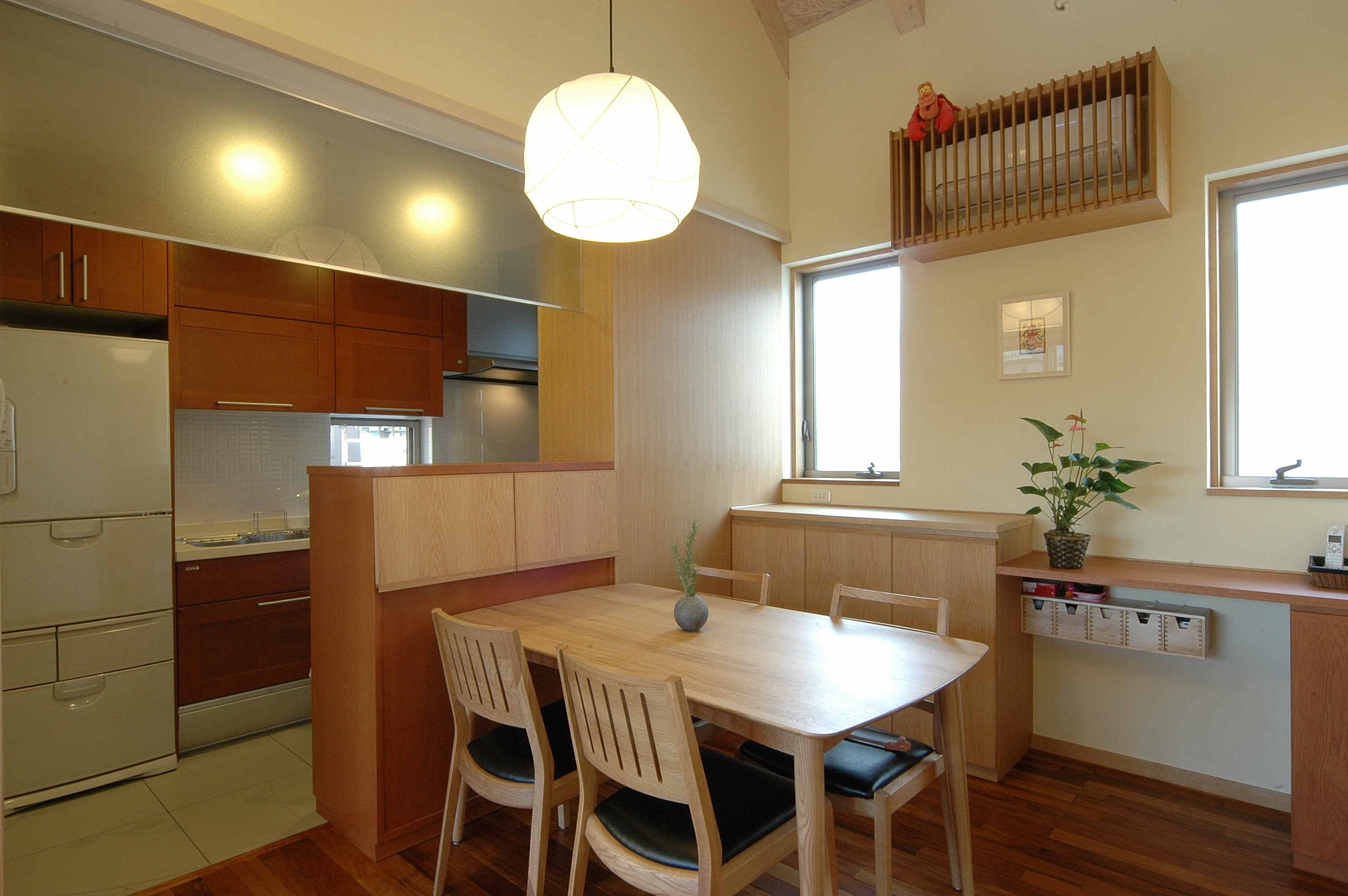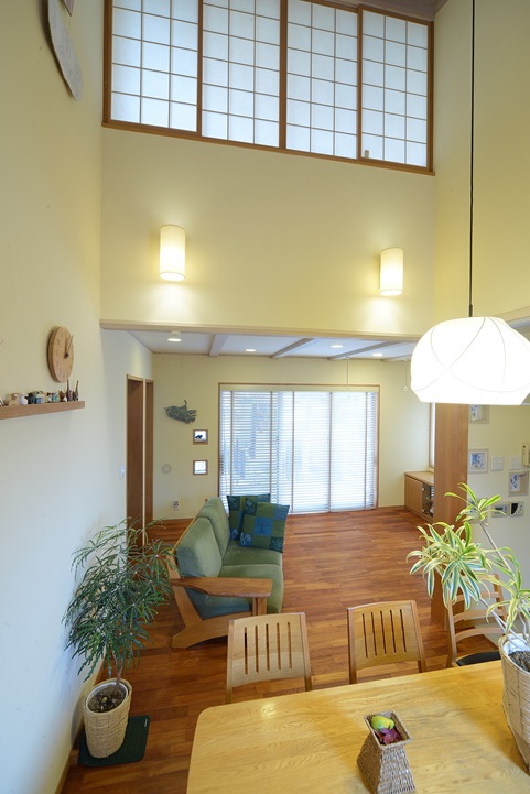 内装は、床は無垢のオーク材・チーク材・ボルドーパイン、壁は珪藻土やワラなどの自然素材を使用。外張断熱なので夏涼しく冬暖かい。省エネで快適な住宅です。