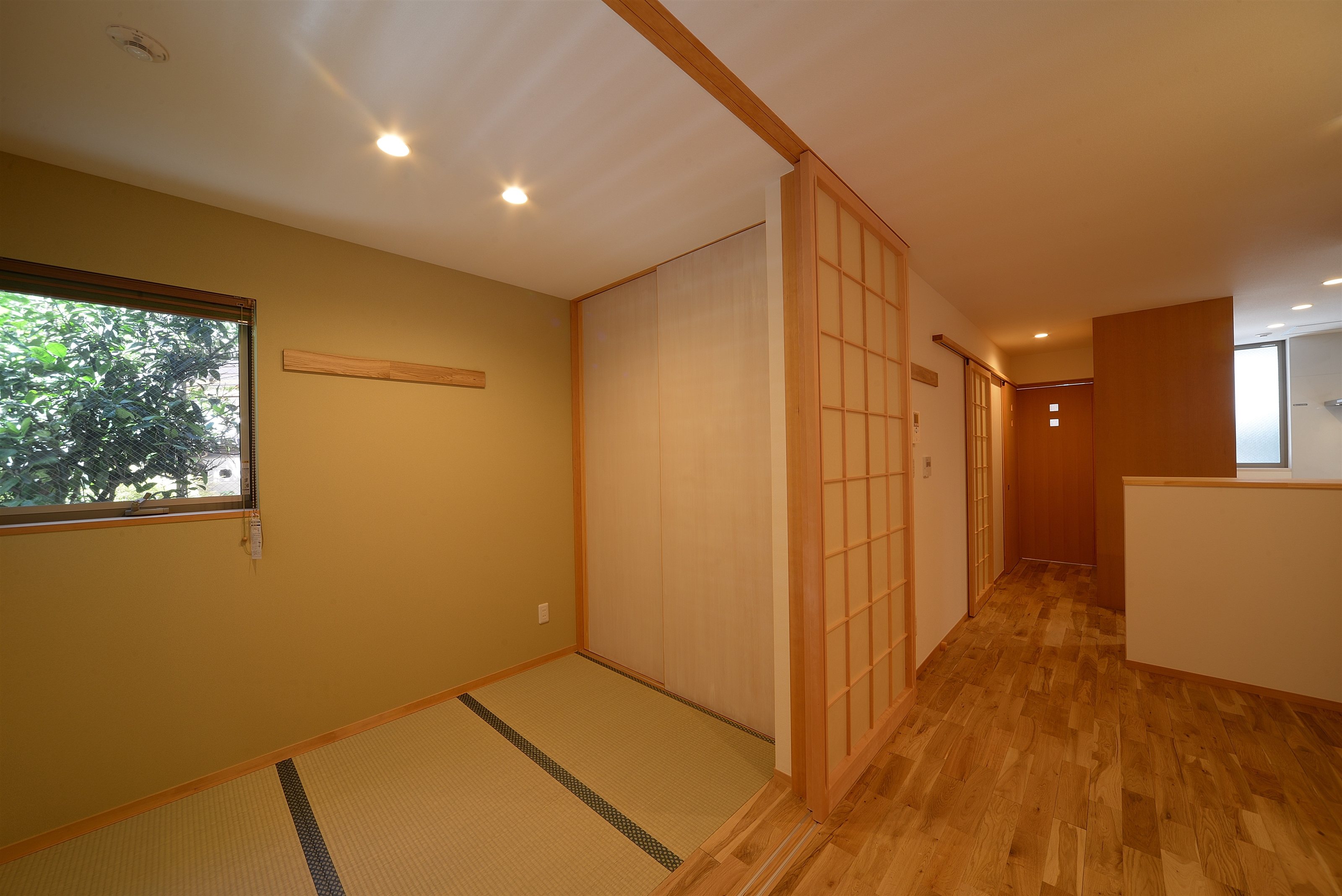 各階は扉を開くことでワンルームになるよう計画されているので、階ごとにエアコンは1台で済むようになっています。夏は庇により日差しを遮り、冬は大きな開口により陽の光を採り込むというパッシブ設計の手法も採用し、エコで快適な住まいとなっています。