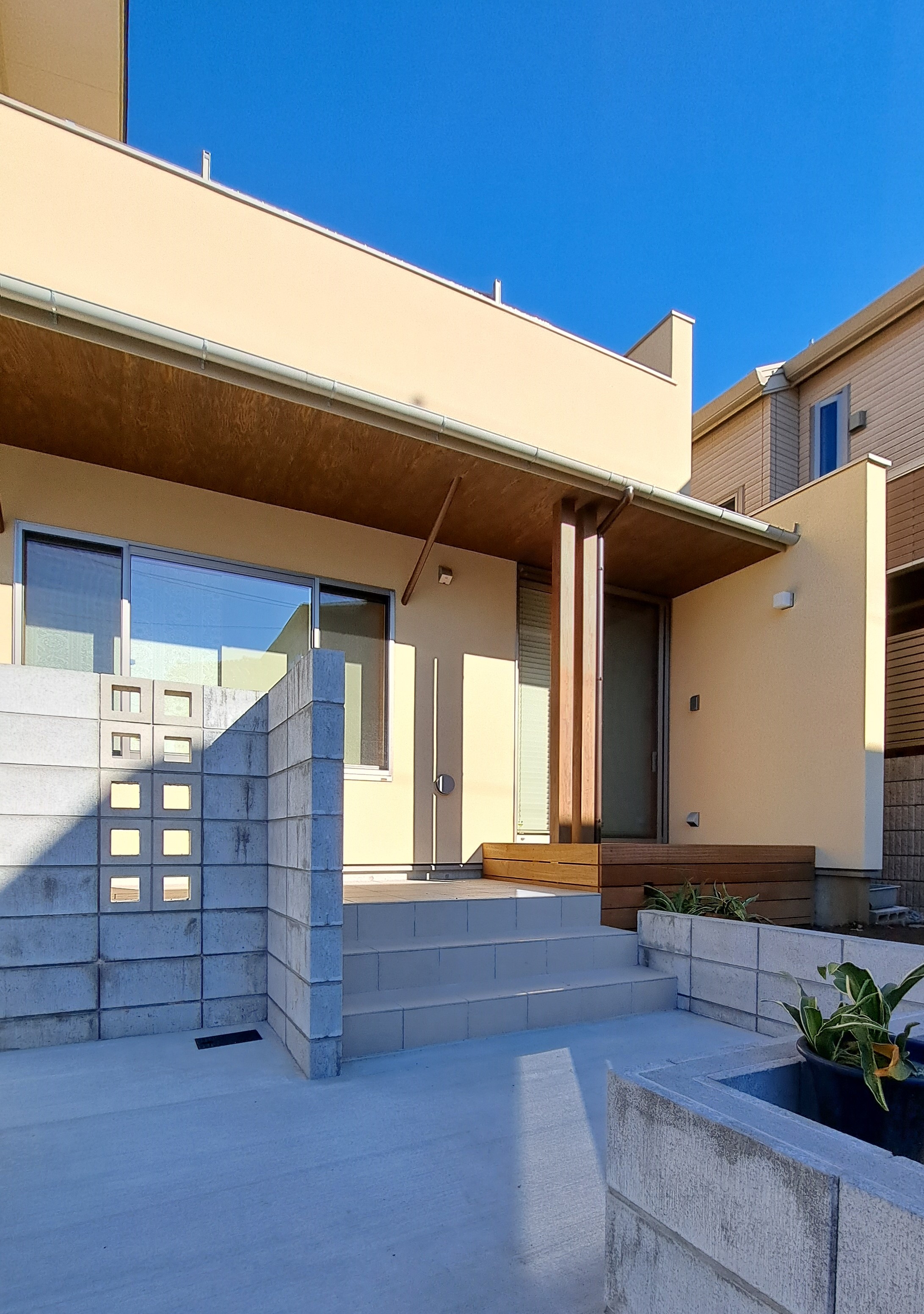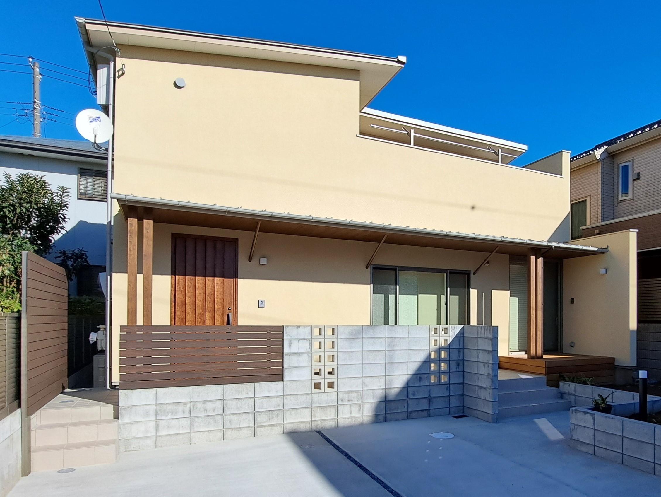 静かな住宅街に建つ横に長い庇のある住宅。床下エアコンによる床暖房の住まいでもあります。