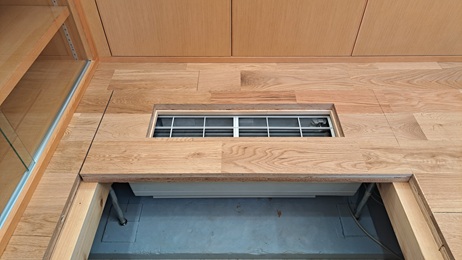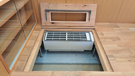 エアコンの吸込み口と蓋に隙間スポンジを張って気密性を高めます。エアコンに近いほど床面自体が暖かくなり輻射熱による暖房(床暖房)の効果があります。