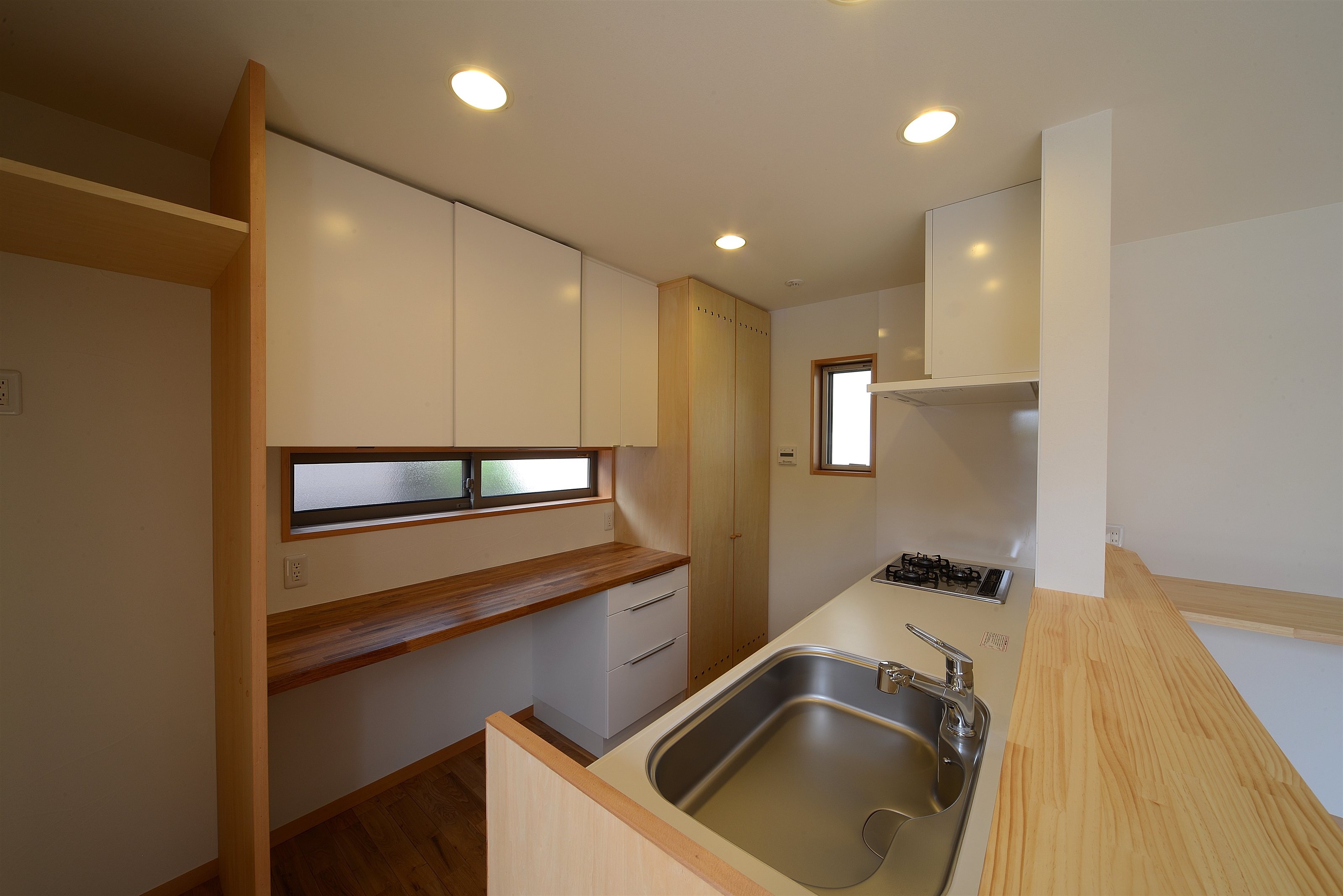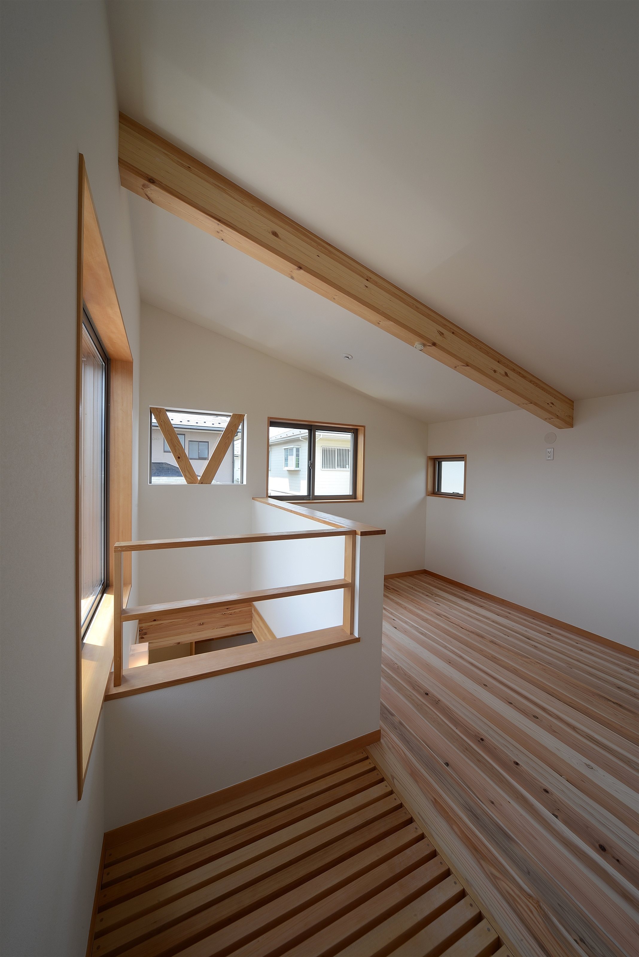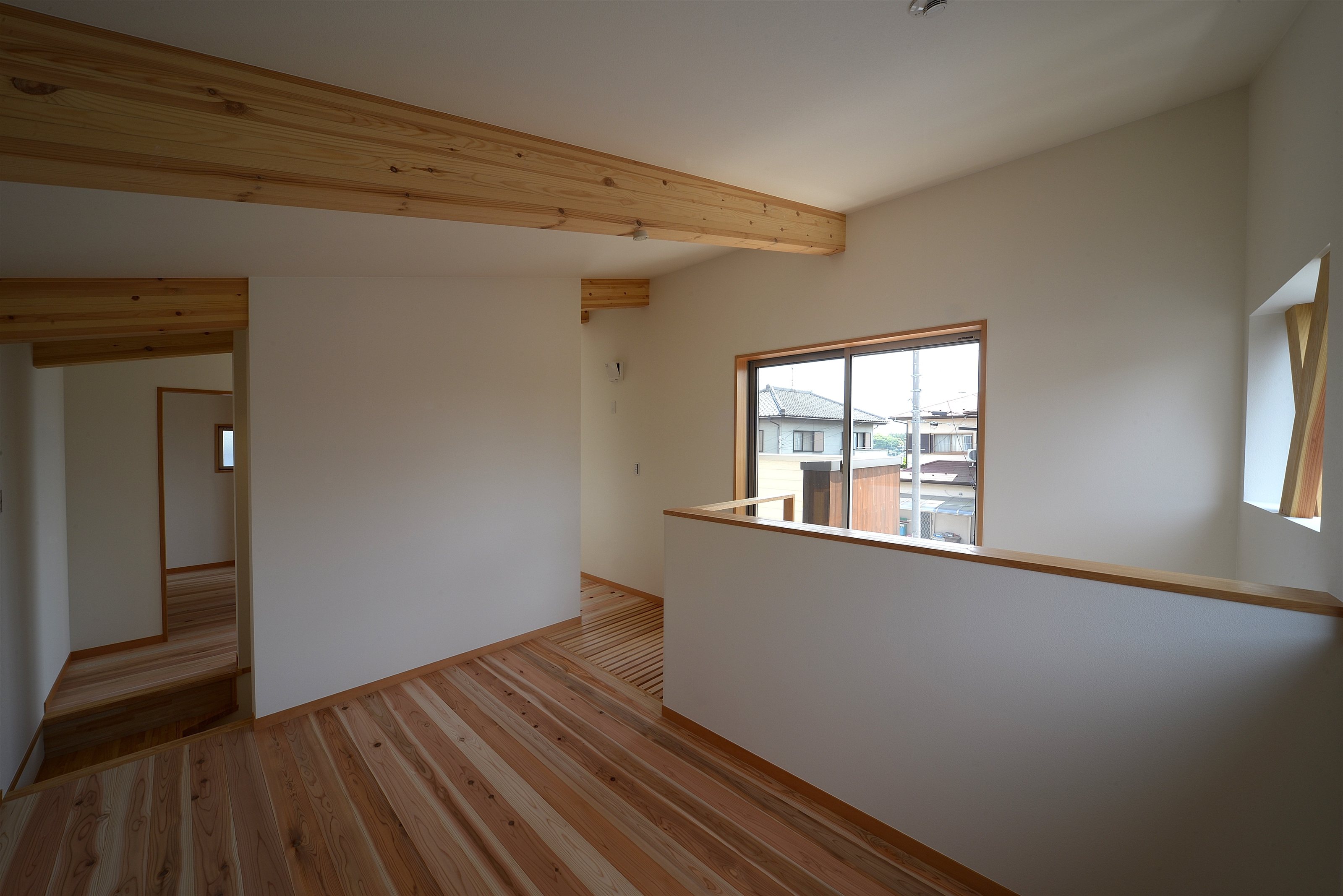 L型プランの採用で、東側隣家の中庭に対しては閉じつつも南西方向に開かれているため日差しがたっぷり確保出来ました。蓄熱式の床暖房が敷設してある居間、食堂、キッチンは午前中いっぱい、南西側に窓を向けた寝室には午前から午後にかけて陽が入ります。小さいながら吹き抜けがあり、冬季の日差しを確保しながら夏の熱気を抜くことも出来るようになっています。子供たちの成長に合わせて使い方をゆっくり考えようと、2階はオープンスペースになっています。