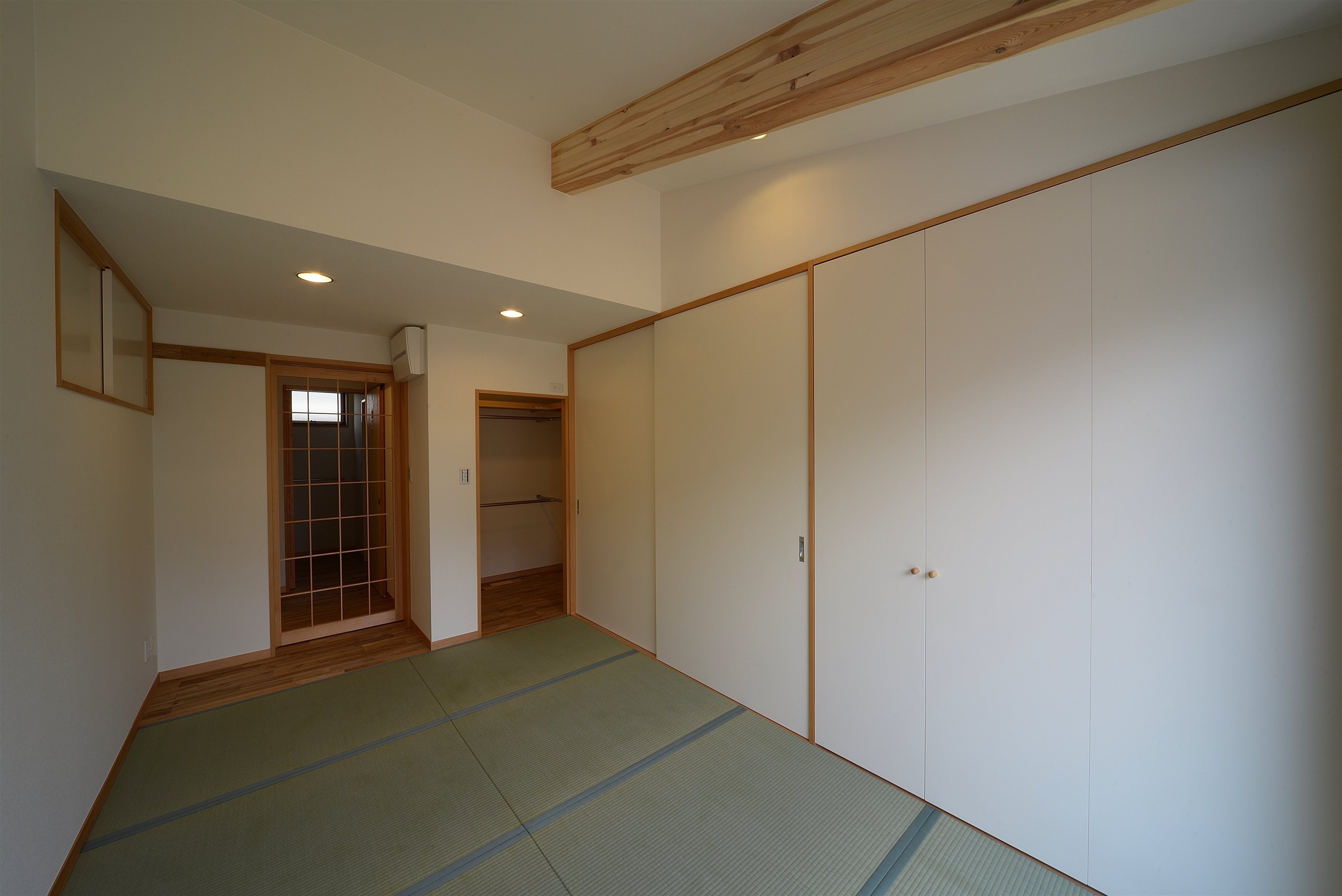 内装は床にナラ材と杉、壁は漆喰となっています。梁の一部を現して建物を低く抑えつつもゆったりとした天井高を確保。断熱にはペットボトルを再生したリサイクル断熱材を充填しています。施工精度が高く、製造過程でのエネルギー消費も抑えられているのでエコに優れた住まいと言えます。