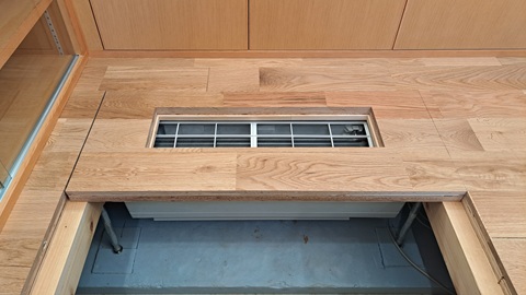だいぶ前ですが床下エアコンの吹き出し口が出来ています。取り外し出来て、吹き出し量が多いと感じた時には厚紙を挟むだけで風量の調整ができます。アナログですが故障もなく確実な方法です。