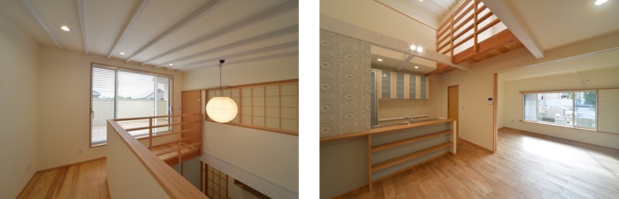 2階寝室から吹き抜け、その先の図書コーナーとベランダを見ています。前回紹介した 『壁内の結露を防ぐための下地』が貼ってあります。内部結露を起こさないか計算して確かめ、防湿フィルムを張らなくても良い仕様にしています。