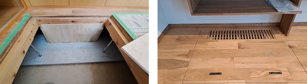 右の写真は設置後の仕上がりです。手前の回転取っ手付いた部分がが点検口の蓋で、奥のガラリが吸込み口です。細かい構造については後日紹介させていただきます。