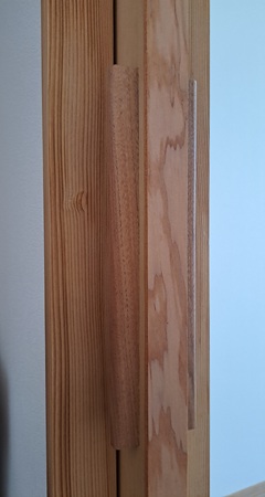 引き戸の引き手です。8月27日の青線で囲った部分の塗装が済みました。木の名前は分かりません・・建て主さんの支給です。長細く切って角を丸めて付けました。