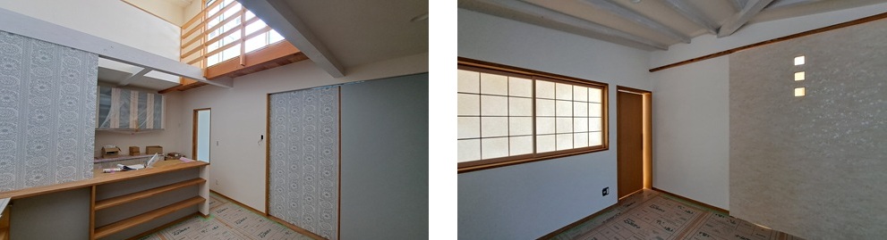左の写真は5月30日の反対側から撮影したものです。よく見ると引き戸の唐紙とカウンターの上下に貼っている壁紙が同じ柄なのが分かるかと・・・。