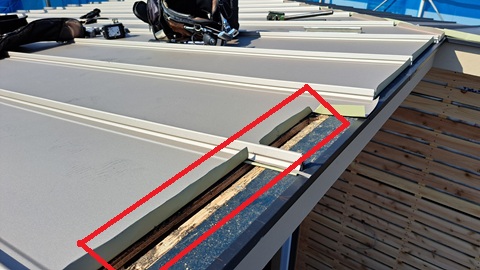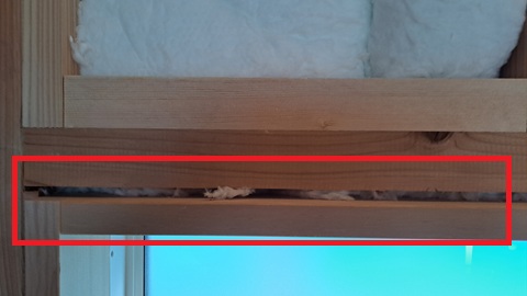 5月15日に屋根の通気について紹介しました。写真は片流れ屋根の棟部分です。通気層を上がってきた熱気がこの穴(赤枠)から抜けていきます。