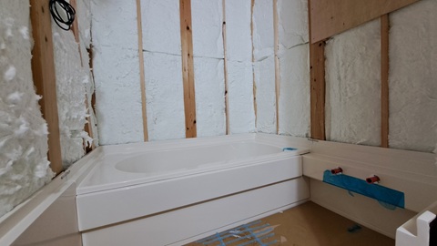 ハーフユニット式(膝から上は好きな素材で仕上げられます)の浴槽と洗い場の設置が済みました。正面と右側は外壁に面した壁ですが、左側と手前は室内(便所と脱衣室)に面した壁です。