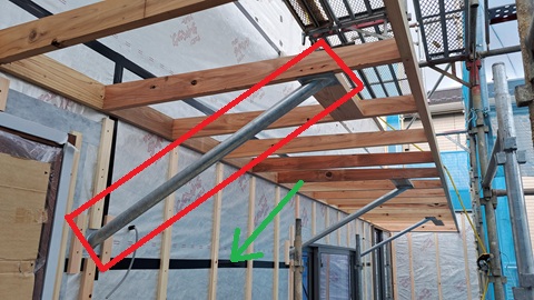 赤矢印がコンクリートを打ち込む前の断熱材です。コンクリートの浮力に負けないよう上をしっかり押さえています。上棟し、屋根や窓が付いて雨が吹き込まなくなった時点で床の合板を貼りますが、その直前に基礎の床面にも断熱材を貼っていきます。機会があればまた紹介いたします。