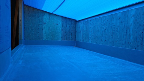 ベランダの防水工事です。ケイ酸カルシウム板の上にFRP防水をしました。窓開口の靴摺り部分、ベランダ壁の立ち上がり部分にも塗り上げているのを確認しました。防水が終わるまでは雨が吹き込まないようブルーシートで簡易な屋根を作ってくれています。