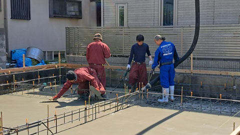 写真左の人から作業の紹介です。コテでコンクリートを平らにならす人。大きなトンボでおおざっぱにコンクリートを均す人(この人はコンクリートのレベルもチェックしています)。コンクリートをバイブレーターで流動化させ鉄筋の間に流し込む人(責任者でもあります)。そして一番右の人はポンプ車をリモコン操作しコンクリートを圧送する人。
