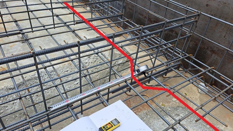 基礎の鉄筋工事が進みます。最近はコストダウンのために建物内部の地中梁(赤く示したように下方に凸させて床版が下に反らないよう補強する)を省略することが多くなりましたが、小生は建物を支える大切な部分なので余裕を持たせられるよう要所に配置しています(もちろん省略する場合も構造計算し安全を確かめます)。