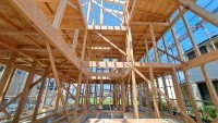 8月20日に上棟しました。小生設計の1戸建て住宅としては最大規模160畳です。遠景はいずれ紹介いたしますが、吹き抜け面積も2,3階合わせて22畳分あり、構造担当のUさんには少しばかり苦労を掛けてしまいました。骨組み状態の写真では分かりずらいですが、これから工事が進むときっと面白くなってくると思います。工事の進行を妨げないよう9月半ばから日曜日に限り希望の方に現場を案内いたします。くわしくは 見学会コーナーをご覧ください
