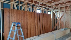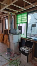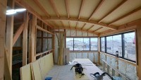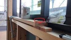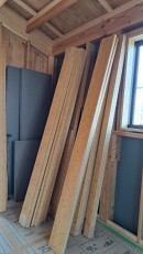 建て主さんの自社製品の搬入をしました。下の写真は造作材で建具枠です。例えば引き戸の場合は工務店の作業場でハンガーレールを埋め込むための溝を掘ったり、設置する壁仕上げの厚さに合わせて幅を調整したものを現場では大工さんが長さを調整し、組みたててから取り付けます。このような造作工事と断熱材の充填を2人の大工さんが並行して進めています。