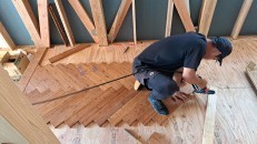 作業は順調に進んでいます。玄関のフローリングはヘリンボーン貼りにしてもらいました。当初予定にはありませんでしたが、建て主さんの自社制作のフローリングです。貼り方も『試しにこうしてみたい』が反映されています。時間をかけて丁寧に貼ってくれています。