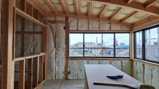定例打合せ。断熱材の充填が完了したので建て主さんに確認をしてもらいました。壁の白い断熱材は高密度グラスウールです。壁にそのまま立て掛けられるくらいの硬さがあります。壁内結露しないよう結露計算をして確かめたうえでビニールでラッピングされていないタイプを採用しています。湿気は建物の外にも室内側にも自由に抜けられるようにしています。冬の結露はもちろん、最近は夏型結露が怖いので・・大工さんにはチクチク痛い思いをさせてしまい申し訳ないという思いがありますが、夏型結露と施工精度を考えるとラッピングされていない断熱材は優れていると思います。