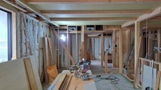 定例打合せ。内装工事が進み部屋の広さ、ドアの高さ、天井の構成などが分かるようになってきました。(下右の写真)10月14日には天井の断熱材が見える状態でしたが今回は石膏ボードが貼ってあります。(下左の写真)は2階の東側客間です。梁が並んで見える天井の様子も分かるようになりました。この後、下がり天井、吹き抜けに面した腰壁なども出来上がっていきます。来週は階段の設置工事も始まっていると思います。寒くなってきましたが断熱が聞いているので中は温かく感じます。