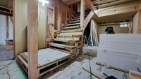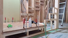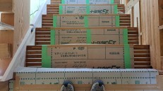 定例打合せ。壁のボード貼りと造作工事が並行して進みます。いよいよ階段の設置が始まります。1階の1段目はステージ状に広くなっていてフローリングのヘリンボーン貼りです。2段目からはアクリル板を挟んだ集成材で仕上がりが楽しみです。この階段は結構大変で、腰壁にはバンブーブロック、引き戸が壁際を走り、段の下はロボット掃除機の基地になっていて、途中からはストリップ階段に・・来週は姿が分かるようになっているはずです