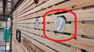 定例打合せ。外壁(左官仕上げ)の下地工事が進みます。写真は通気のための空間を作りながら杉板を貼ってる様子です。この杉板に防水の為のアスファルトルーフィングとモルタルを壁に塗り留める(表現が難しいです・・)ための金網を貼っていきます。赤い丸は換気扇ダクトで、分かりにくいですが杉板の隙間から防水のための緑色のカバーがかろうじて見えています。細かい部分もしっかりと