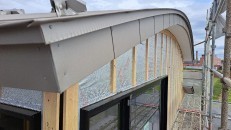 定例打合せ。湾曲した屋根の破風板が付きました。20cmくらいの長さに切って折り曲げ加工した板金がつながって曲線を描いているのが分かると思います。このようなリズムよくきれいに並んだ部材が建築の美しさを表現するのだと思う今日この頃。